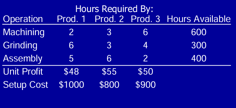 Max : 48x1+55x2+50x3-1000Y1-800Y2-900Y3