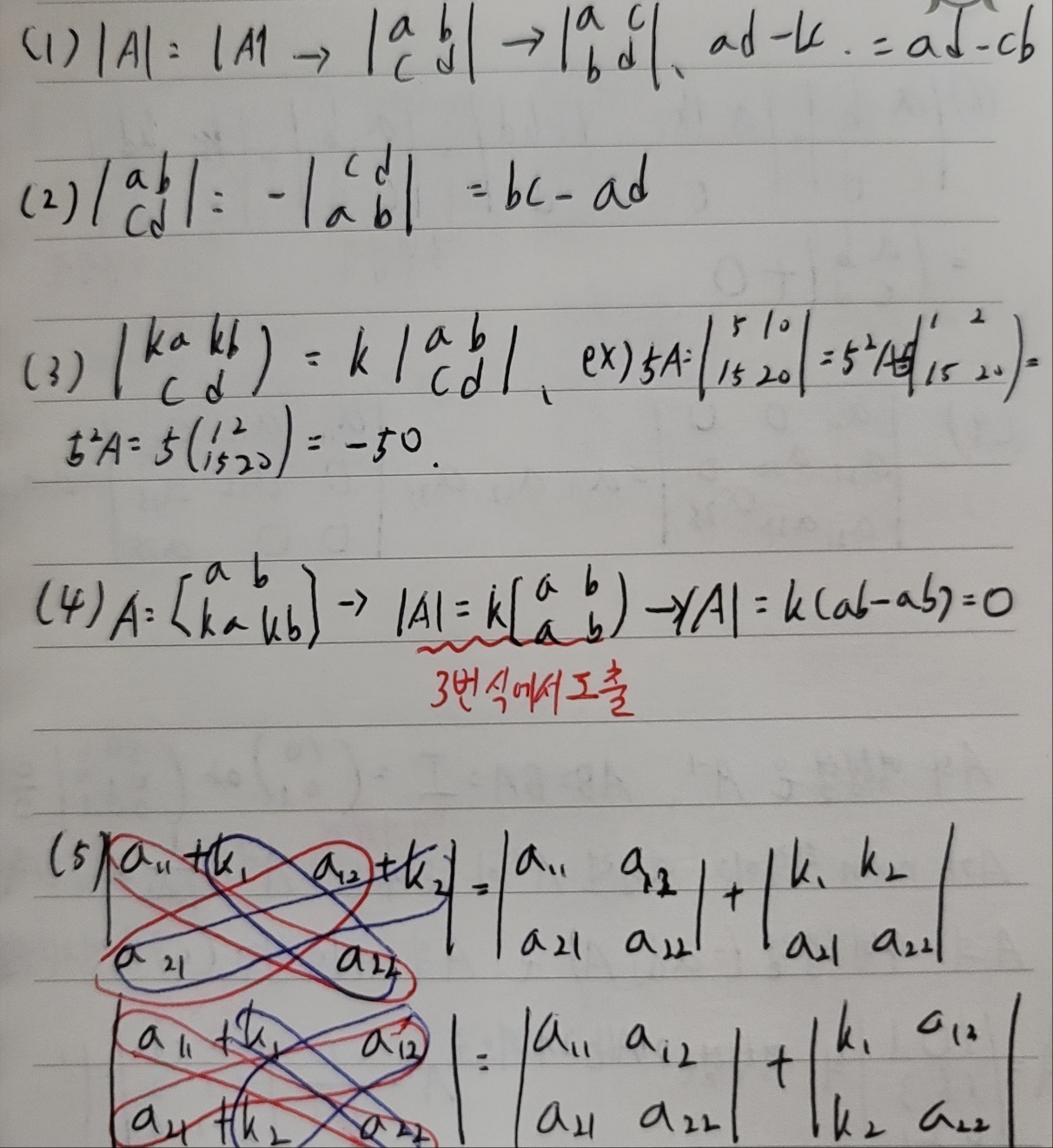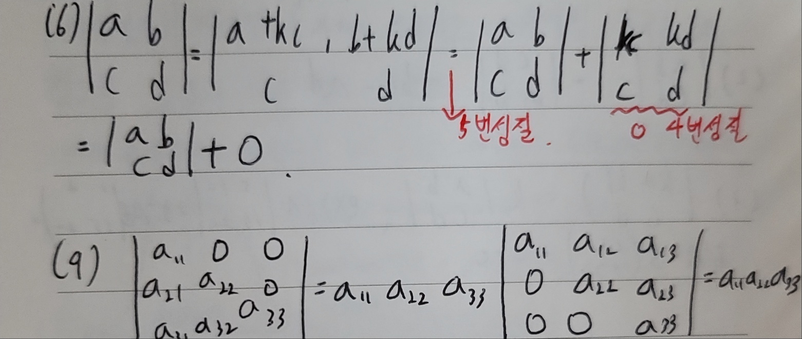 (4) 두 행이 같거나 비례하면 행렬식의 값은 0 이다.